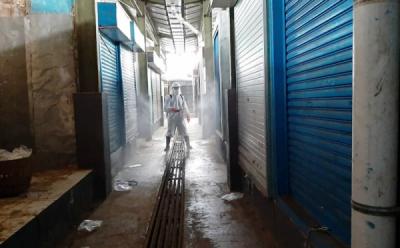 Cegah Penyebaran Covid-19, Relawan PMI Sterilisasi Pasar Purwanegara