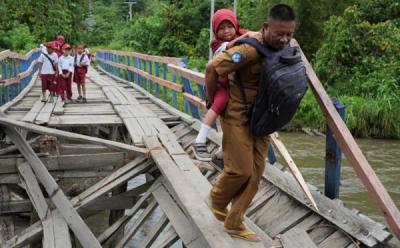 Potret Siswa di Lebak Banten Menyeberangi Jembatan Rusak Menuju Sekolah