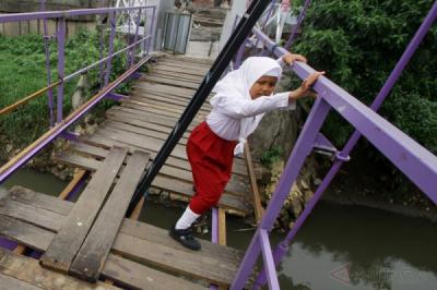 Nekat, Murid SD Gunakan Jembatan yang Rusak untuk Menyeberang