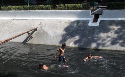 Asyiknya Anak-Anak Berenang di Aliran Air Kotor Kawasan Bundaran HI