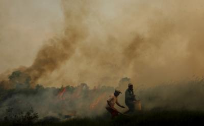 Petugas Damkar dan Warga Berjibaku Padamkan Api pada Kebakaran Lahan Pekanbaru