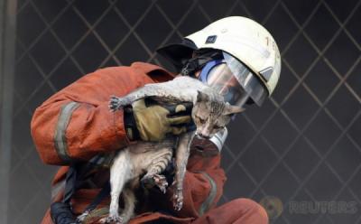Petugas Damkar Selamatkan Kucing dari Kebakaran Pasar Senen