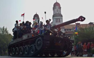 Senangnya Warga Menaiki Tank Militer Saat Kirab Bendera Merah Putih di Semarang