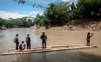 Siswa Seberangi Sungai Menggunakan Rakit di Lebak Banten