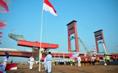 Pekerja LRT Palembang Laksanakan Upacara Bendera di Bantaran Sungai Musi