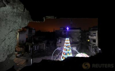 Pohon Natal di Tengah Reruntuhan Bangunan Jadi Titik Kumpul Warga Rayakan Malam Natal