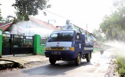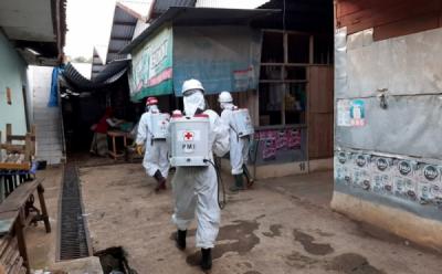 Relawan PMI Semprot Disinfektan Pemukiman Warga Kecamatan Walantaka, Kota Serang