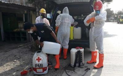 Relawan PMI Keliling Pasar Tradisional Cerih Semprot Disinfektan