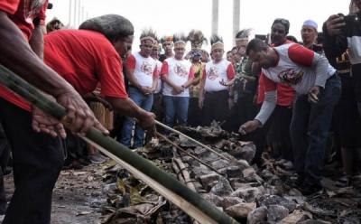 Intip Proses Tradisi Bakar Batu di Monumen Pembebasan Irian Barat