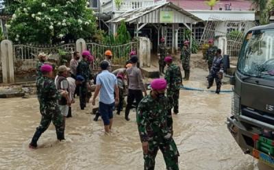 Prajurit TNI Bersihkan Lumpur Banjir Bandang di Bone Bolango