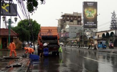 Aksi Pasukan Oranye Bersihkan Sampah saat Hujan