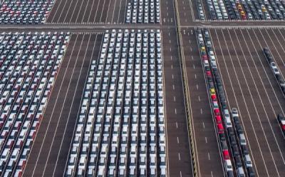 Foto Udara Deretan Mobil yang Akan Dieksor di Pelabuhan Patimban