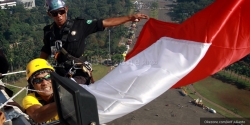 Aksi Pendaki Tunadaksa Kibarkan Merah Putih di Puncak Monas