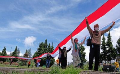Peringati Hari Kesaktian Pancasila, Relawan Bentangkan Bendera Merah Putih di Candi Arjuna Dieng