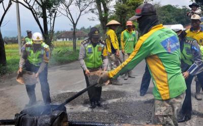 Polisi Ikut Bantu Tambal Lubang Jalan di Temanggung