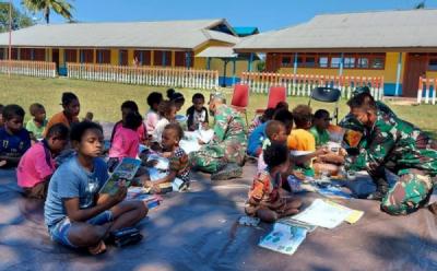 Keceriaan Anak-Anak Belajar di Perpustakaan Keliling Yonif 125/SMB