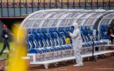 Gawang Disemprot Disinfektan Sebelum Pertandingan