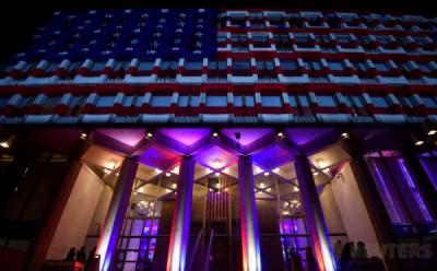 Semarakkan Pilpres AS, Gedung Kedutaan Dicat Warna Bendera AS