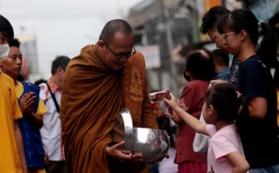 Warga Memberi Makanan kepada Biksu saat Proesesi Pindapata Jelang Puncak Waisak 2567