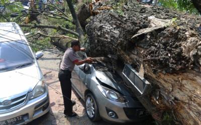 Hujan Deras Disertai Angin Kencang, Pohon Tumbang Timpa Mobil