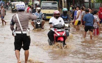 Atur Lalu Lintas, Anggota Polisi Gulung Celananya saat Banjir Genangi Banyuwangi