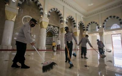 Polisi Bersih-Bersih Masjid Agung Karanganyar Jelang Ramadhan