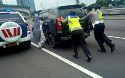 Polwan Dorong Mobil Mogok di Tol Dalam Kota