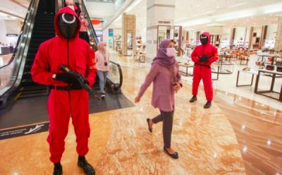 Petugas Keamanan Berkostum Squid Game Jaga Pengunjung Pusat Perbelanjaan