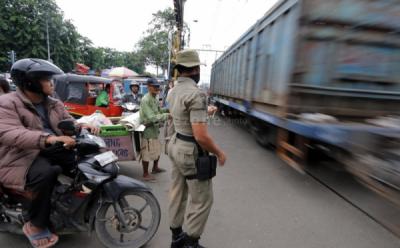 Satpol PP Atur Lalu Lintas di Pintu Perlintasan Kereta