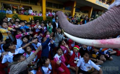 Serunya Siswa SD Saat Berebut Hadiah Natal dari Belalai Gajah di Thailand
