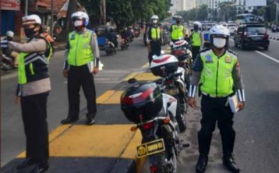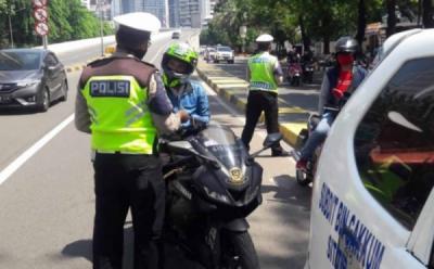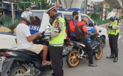 Polisi Tilang Pengendara Sepeda Motor yang Tidak Pakai Helm dan Masker