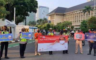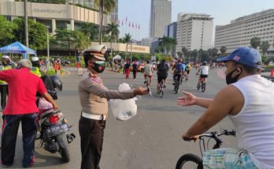 Polri Sosialisasi Protokol Kesehatan dan Bagikan Masker ke Warga di Bundaran HI