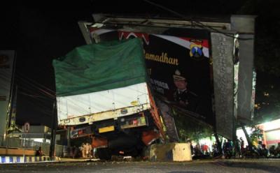 Hindari Motor yang Melawan Arah, Truk Ekspedisi Tabrak Papan Reklame
