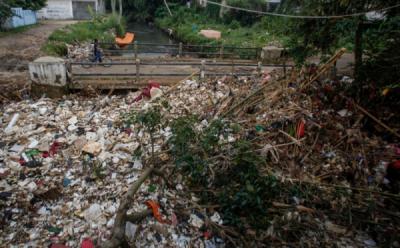 Potret Tumpukan Sampah Sumbat Aliran Sungai di Depok