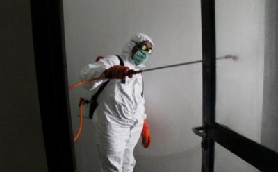 Wisma Atlet Kemayoran Disemprot Disinfektan