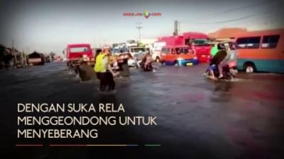 Banjir Jalur Pantura, Polisi Gendong Anak Kecil Menyeberang