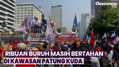Bakar Ban dan Sampah, Ribuan Buruh Masih Bertahan di Kawasan Patung Kuda