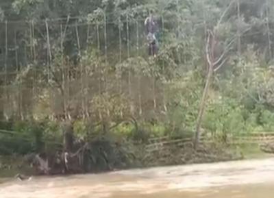 Jembatan Rusak, Warga Nekat Melintasi Sungai Berarus Deras