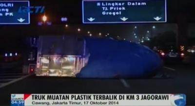 Truk Muatan Plastik Terbalik di Jagorawi