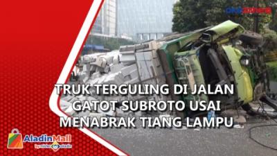 Truk Terguling di Jalan Gatot Subroto Usai Menabrak Tiang Lampu