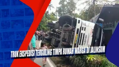 Truk Ekspedisi Terguling Timpa Rumah Warga di Jalinsum