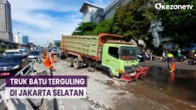 Truk Bermuatan Batu Split Terguling di Jalan MT Haryono, Jakarta Selatan