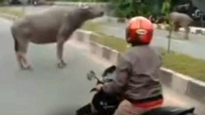 Kerbau Seruduk 2 Motor, 2 Warga Panjat Pohon