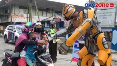Robot Transformer Bumblebee Bagi-Bagi Masker di Jalanan Kota Pangkalan Bun