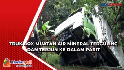 Truk Box Muatan Air Mineral Terguling dan Terjun ke Dalam Parit