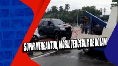 Sopir Mengantuk, Mobil Tercebur ke Kolam Patung Kuda Arjuna Wiwaha