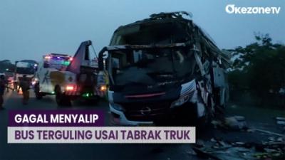 Gagal Menyalip, Bus Terguling Usai Tabrak Truk di Tol Surabaya-Gempol