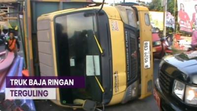 Truk Bermuatan Baja Ringan Terguling di Tambora
