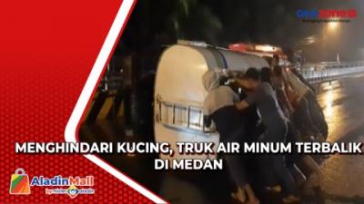 Menghindari Kucing, Truk Air Minum Terbalik di Medan