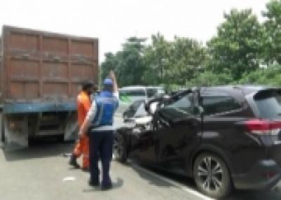 Diduga Mengantuk, Minibus Tabrak dan Tersangkut Kolong Truk di Ruas Tol Dalam Kota